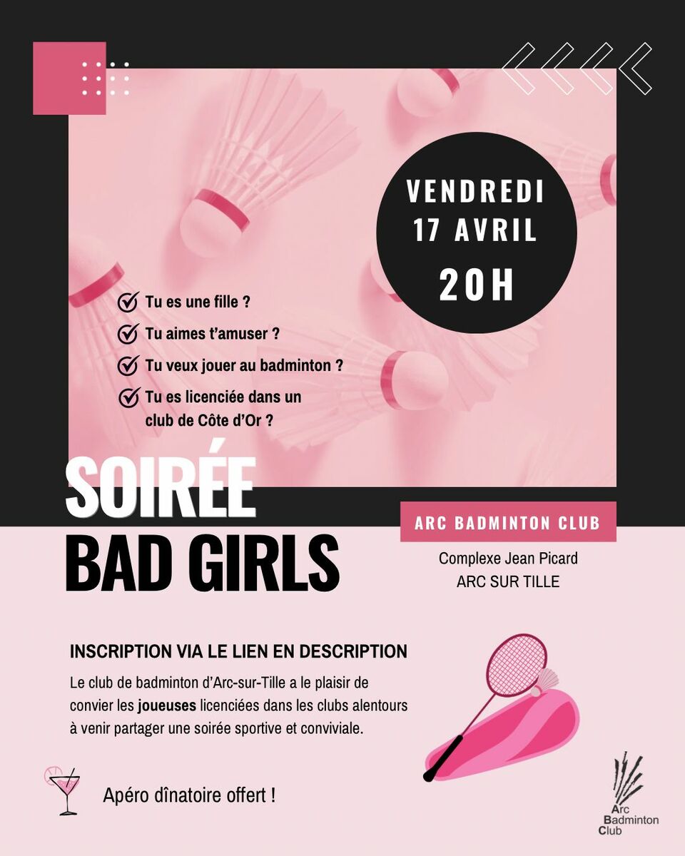 Le club d'Arc-sur-tille a le plaisir de vous convier à sa prochaine soirée réservée aux FEMMES pour s'amuser et partager autour du bad (mais pas que) le temps d'une soirée !
